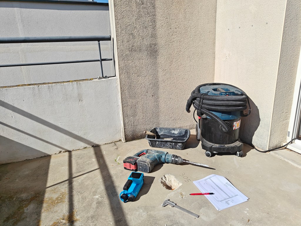 Dans un second temps, nous avons procéder à des sondages avec pachomètre et piqueur afin de vérifier les aciers présents dans les balcons.